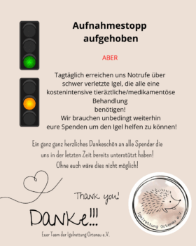 Aufnahmestopp aufgehoben ABER Tagtäglich erreichen uns Notrufe über schwer verletzte Igel, die alle eine kostenintensive tieräztliche/medikamentöse Behandlung… Mehr lesen